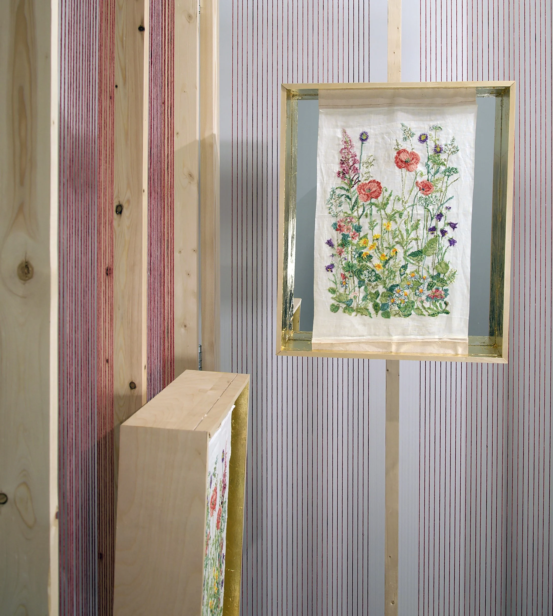 embroidery floss, cotton Adia, glass mirror, birch, pine, steel brackets