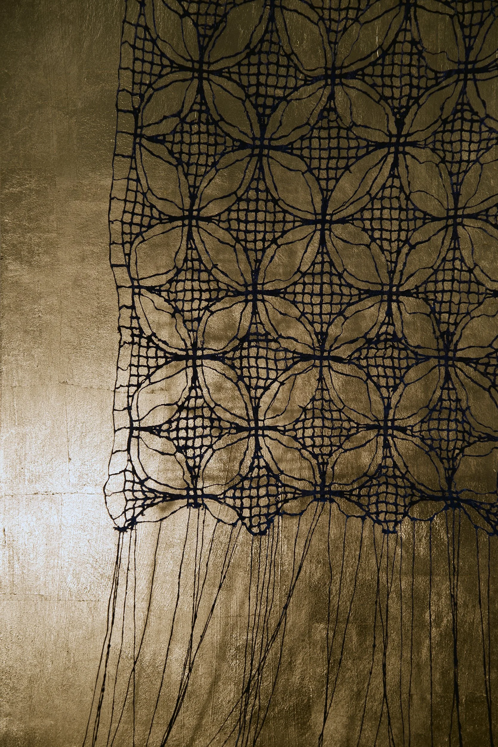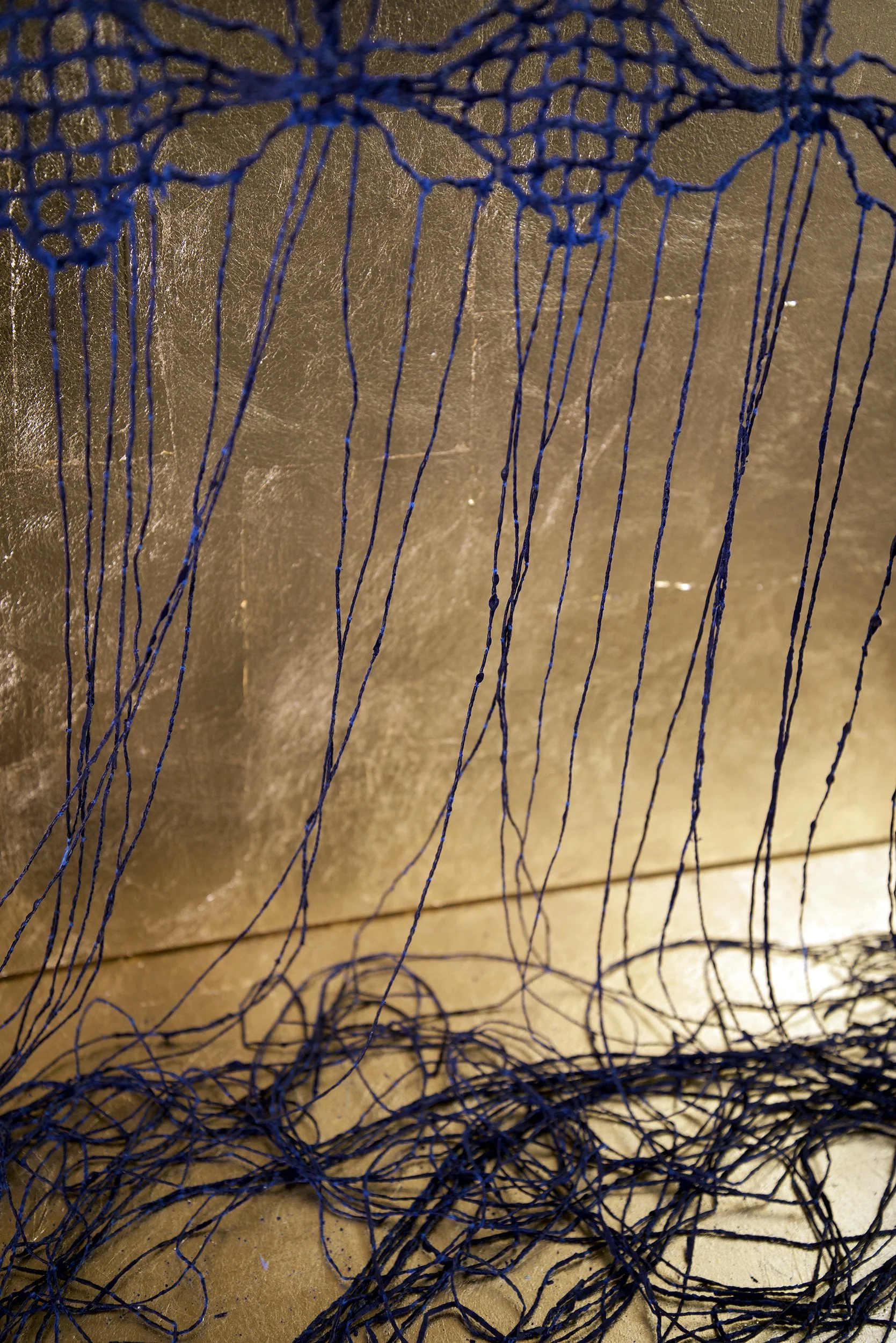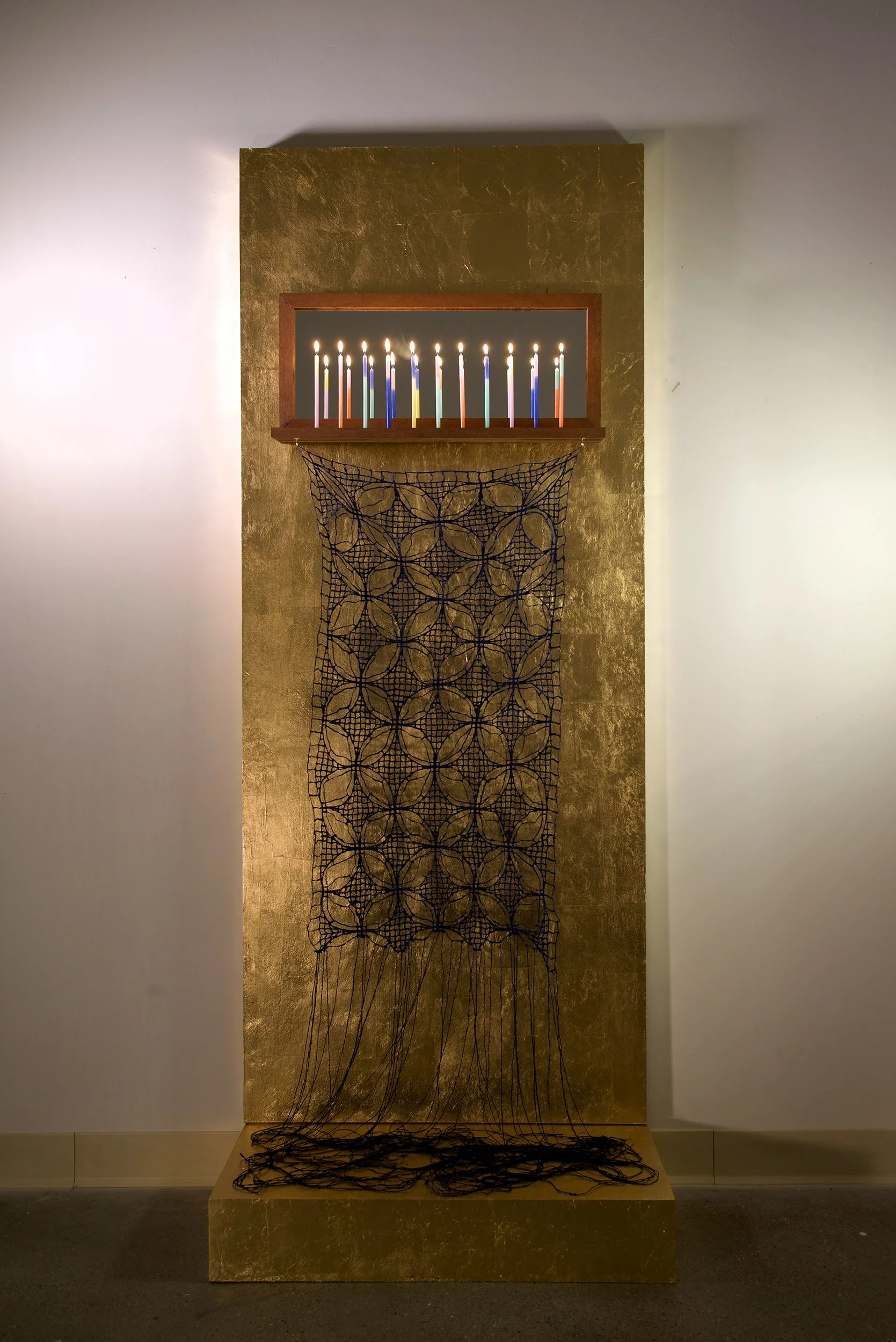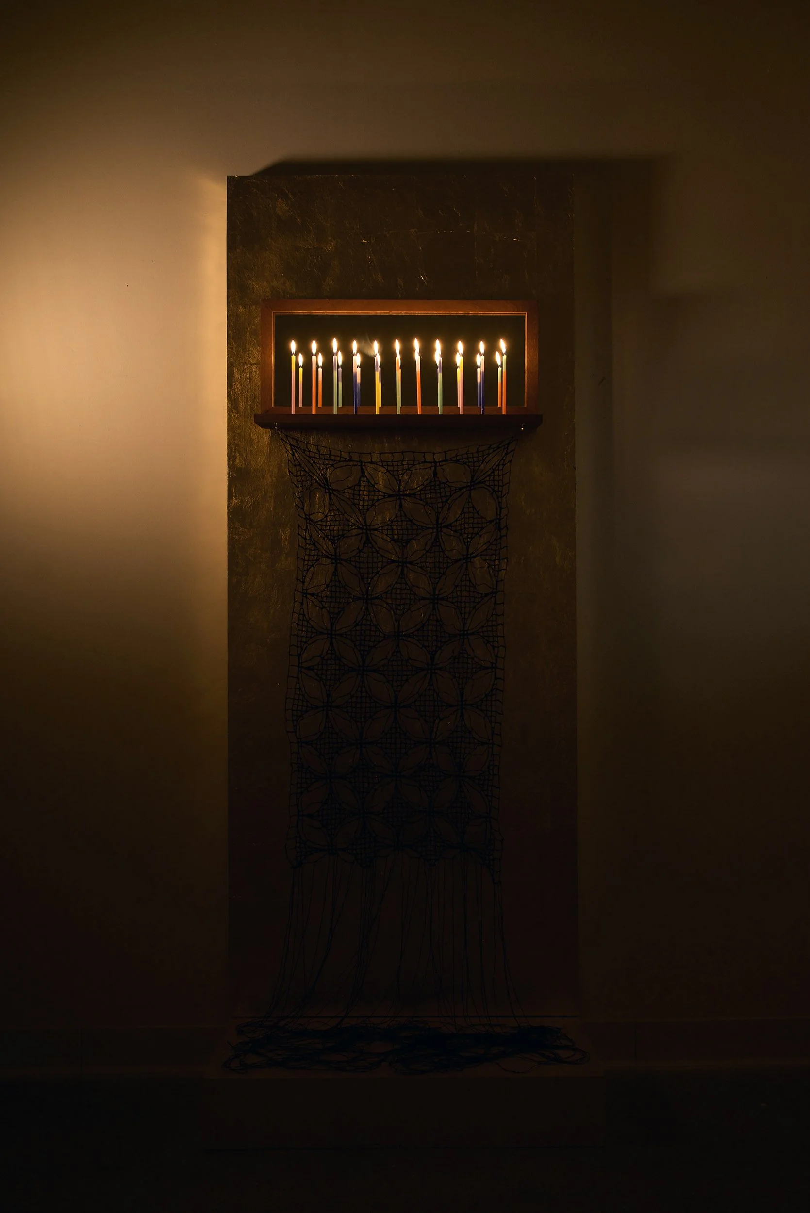 beeswax, cotton wick, Indigo-dyed cotton thread, black walnut, glass mirror, faux gold leaf